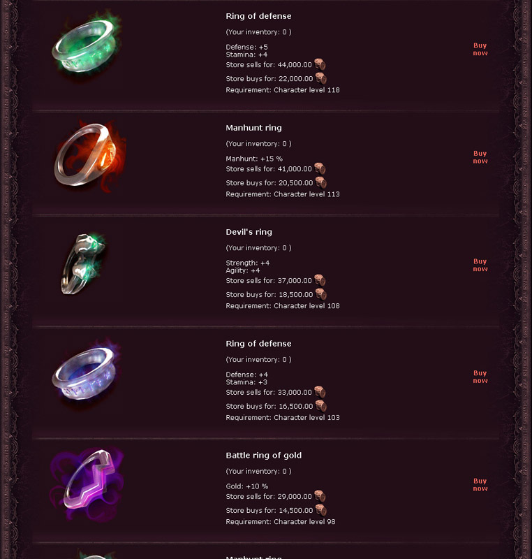 - There are basically 3 categories of rings: manhunt, battle/gold and rings that improve the basic stats of your character in the battle. Only the best manhunt or battle/gold ring you possess is used to calculate your bonus and only one of each type can ever be carried. Rings that improve your stats during battles are also selected based on the required level; duplicate rings of this type (or any other type) are NOT counted, so buying two of one type of ring will never work. If you want to take advantage of all types of rings, buy the best available battle/gold ring, the best available manhunt ring and the best devil’s ring and defence ring OR the best and second best rings of either skill-enhancing type if you want to specialise in defence or offense alone.